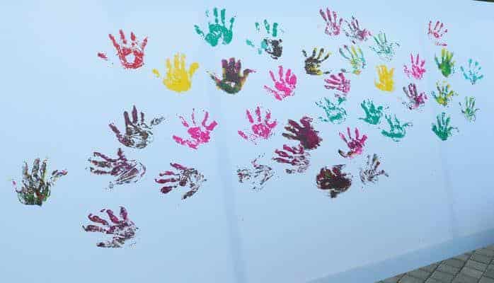 Участники мероприятия совершили еще один символический жест Международного дня мира. Oни оставили на табло цветные отпечатки своих ладоней.