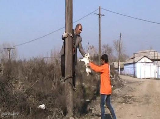 На место происшествия позвали Гусейнова Гасана, электрика по селу Шорсулу Сальянской электрической сети. В целях безопасности была приостановлена подача электроэнергии, после чего электрик забрался на столб и спас кошку.