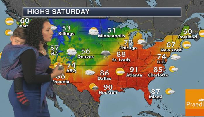 В городе Миннеаполис (штат Миннесота) ведущая прогноза погоды Сьюзи Мартин появилась в эфире с засыпающим на спине ребёнком.