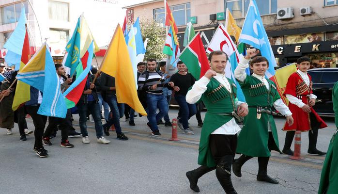 Участники фестиваля, одетые в традиционную одежду тюркоязычных народов, организовали шествие к центральной площади Эрзерума, держа в руках флаги тюркских стран.