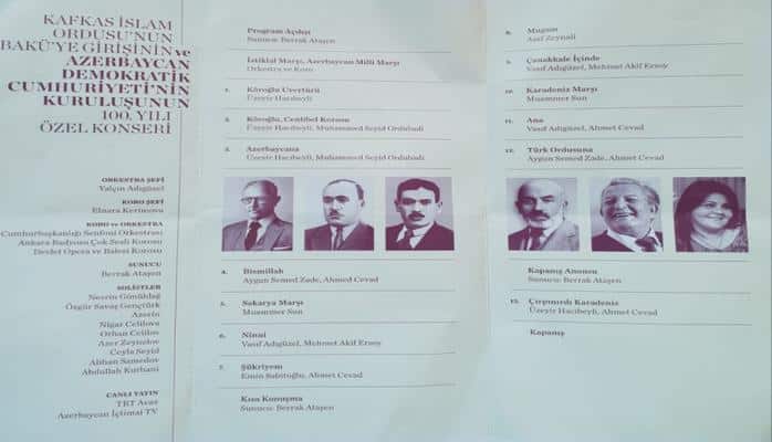 В сопровождении Президентского симфонического оркестра Турции под управлением народного артиста Азербайджана Васифа Адыгезалова и Государственного хора TRT под управлением народной артистки Азербайджана Эльнары Керимовой, азербайджанских и турецких солистов прозвучали произведения известных композиторов братских стран – Узеира Гаджибейли "Koroğlu" и "Çırpınırdı Qara Dəniz", Асефа Зейналлы "Muğam", Васифа Адыгезалова "Çanakkale içinde", "Ninni" и "Ana", Эмина Сабитоглу "Şükriyyəm", Муаммера Суна "Sakarya Marşı" и "Karadeniz Marşı", Айгюн Самедзаде "Türk Ordusuna" и "Bismillah". Авторы слов произведений – Ахмед Джавад, Мамед Саид Ордубади и Акиф Эрсой.