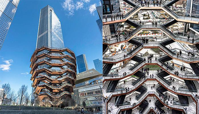 Vessel – изюминка нового комплекса Хадсон Ярдз, включающего в себя небоскребы, рестораны, торговые центры и открытые зоны со множеством развлечений. По сути, Vessel – это вертикальная смотровая площадка, напоминающая лабиринт. Ее диаметр у основания составляет 15 метров, в верхней части – около 46 метров. Каждый лестничный пролет абсолютно идентичен остальным, из-за чего создается впечатление бесконечной лестницы.