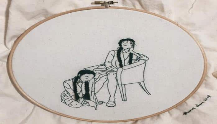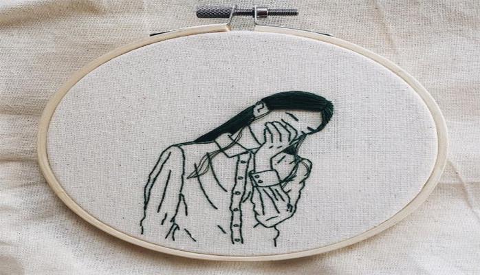 Вышитые женские силуэты с волосами, выходящими за пределы канвы