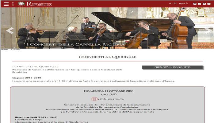 Как сообщили Report в посольстве Италии в Азербайджане, знаменитый "Квиринальский концерт", проходящий каждое воскресенье в зале "Капелла Паолина" Квиринальского дворца президента Итальянской Республики и транслируемый напрямую по общественному радио "Rai Radio 3" в 11.50, 14 октября будет посвящен азербайджанской музыке.
