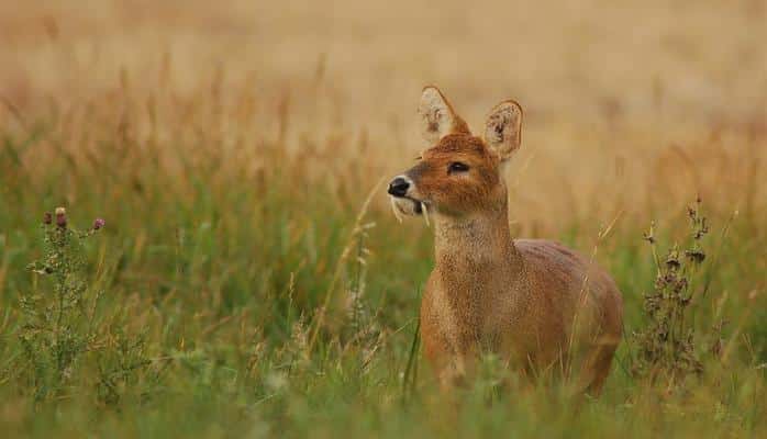 1. Водяной олень (Hydropotes inermis) — это удивительное животное, единственный представитель рода Водяные олени. Длина тела достигает 100 см, высота — 45−55 см, масса — от 9 до 15 кг.