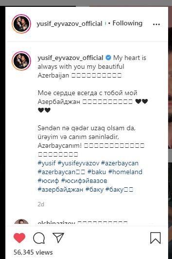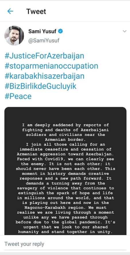 Сами Юсуф в сети Twitter, İnstagram и Telegram рассказал своей многомиллионной аудитории об армянской агрессии в отношении Азербайджана и его мирного населения, почтил память шехидов. Певец также поделился статьей одного из авторитетнейших изданий США The New York Times, где подчеркнута оккупация Нагорно-Карабахского региона Азербайджана вооруженными силами Армении. Публикации отмечены хештегами "Карабах - это Азербайджан", "Помолимся за Азербайджан", "Вместе – мы сильнее" и т.д.