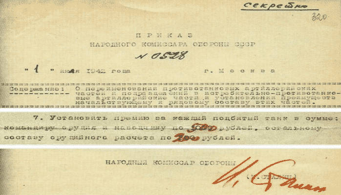 С 1 июля 1942 года за подбитые танки полагались премии командиру орудия и наводчику — по 500 руб. Остальные номера расчета получали по 200 руб.