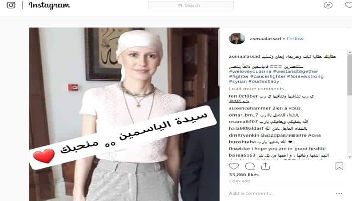 Жена президента Сирии Башара Асада опубликовала на своей странице в "Инстаграме" первую фотографию с того момента, как она начала курс химиотерапии.