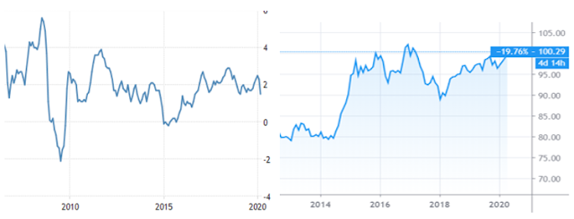 Bu kadar dolar basılmış ve onunla bu kadar yüksek alım gücü yaratılmış iken acaba doların değeri nasıl gelişmiş? Bunu iki şekilde ölçebiliriz. İlk olarak doların iç değerinin nasıl geliştiğine bakmamız gerekir ki bunu dolar enflasyonunun seyrine bakarak görebiliriz. İkinci olarak doların dış değerinin nasıl geliştiğine bakmamız gerekir. Onu da doların 6 önemli para birimine (Euro, Yen, Pound Sterling, Kanada doları, İsveç Kronası, İsviçre Frangı) karşı oluşturulmuş olan Dolar Endeksine bakarak anlayabiliriz. Endeks 100’ün üzerindeyse dolar değerli demektir. Aşağıda soldaki grafik doların iç değerini yani dolar enflasyonun, sağdaki grafik de Dolar Endeksinin değişimini gösteriyor (kaynak: https://tradingeconomics.com/)