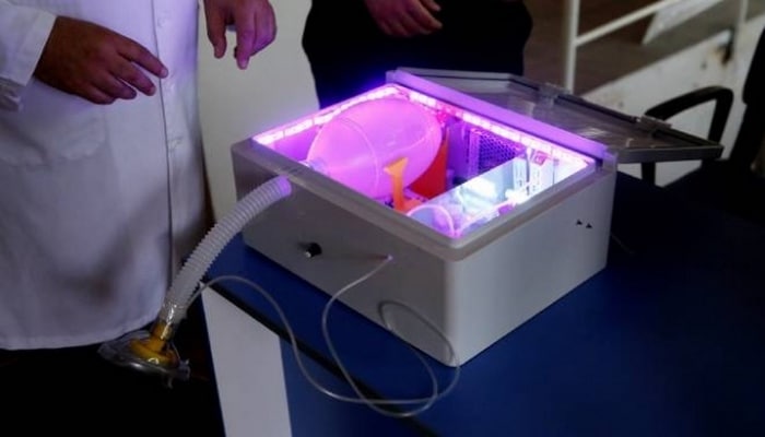 Solunum cihazında hastanın nefesini dışarıya verirken virüslerin sağlık çalışanları ya da çevresinde bulunan sağlıklı kişilere buluşmaması için diğer filtrelere ek olarak ultraviyole ışınlar kullanıldı.