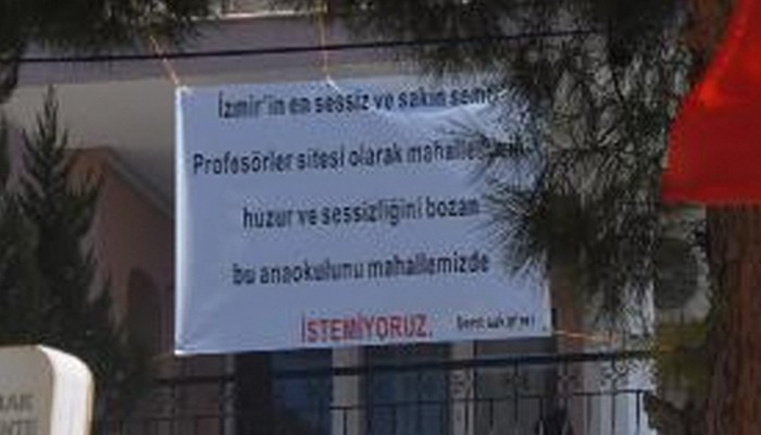 İzmir'in Bornova ilçesinde evinin hemen karşısında bulunan anaokulundan gelen çocuk sesinden rahatsız olan bir vatandaş, balkonuna, "Anaokulunu mahallemizde istemiyoruz" yazılı pankart astı. Pankartı görenler şaşkınlığını gizleyemiyor.