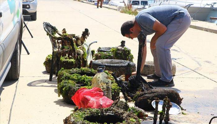 Tekirdağ'da dip temizliği yapan dalgıçlar, aralarında sandalye ve lavabonun da olduğu çok sayıda atığı…