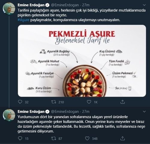 Emine Erdoğan, twitter adresinden yaptığı paylaşımda, "Aşure'ye vazgeçilmez tadı katan, reçetesinde gizli sevgi, birlik ve hoşgörü malzemesidir. Aşure Günü'nün taşıdığı güzide anlamlarla, tüm İslam alemine ve insanlık ailesine barış ve huzur getirmesini diliyorum. Allah tuttuğumuz Muharrem oruçlarını kabul buyursun. Kerbela'nın kalplerimizde hiç dinmeyecek acısı, sevgi ve kardeşlikle birbirimize tutunmanın önemini bizlere bir kez daha hatırlatsın." ifadelerini kullandı.