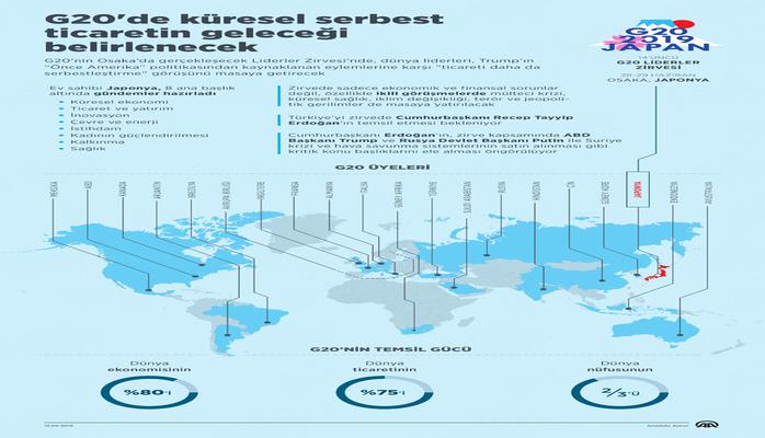 Dünyanın en büyük 20 ekonomisini bir araya getiren G20'nin Osaka’da gerçekleşecek liderler zirvesinde, küresel ticarette korumacılığın artması, istihdam, küresel verinin yönetişimi, kalkınma için altyapı, küresel sağlık, iklim değişikliği, yaşlanan nüfus ve küresel ekonomik dengesizlikler, dijital ekonominin vergilendirilmesi ve ticaret ve jeopolitik gerilimler gündeme gelecek. Dünya liderleri, küresel ticaret ihtilaflarını çözmeye çalışarak, "ticareti daha da serbestleştirme" görüşünü masaya getirecek.