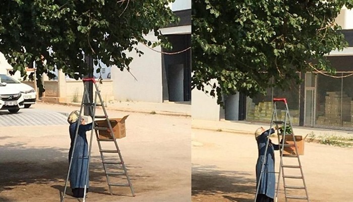 Çevreden bir merdiven ve karton kutu bulan kadın, elindeki yaprakları sallayarak arıları kutuya düşürmek istedi. Arıları toplamak için mücadele eden kadının çabası yeterli olmadı. Olay yerine pikabıyla gelen bir arıcı oğul veren arıları bir kutuyla alıp ayrıldı.