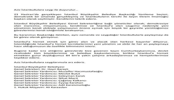 İstifa haberini İBB Genel Sekreteri Hayri Baraçlı sosyal medya hesabından paylaştı.