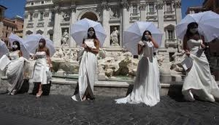 İtalya Düğün ve Hediyelikler Derneğinin "Bize kutlama özgürlüğünü geri verin" çağrısıyla Roma’nın dünyaca ünlü "Aşk Çeşmesi" olarak da bilinen Trevi Çeşmesi önünde toplanan yaklaşık 20 gelin adayı ve düğün organizatörü Covid-19 tedbirleri dolayısıyla düğünlerini yapamama durumunu protesto etti.