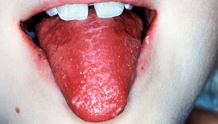 Ağız mukozası değişiklikleri, parlak kırmızı çatlamış dudaklar, kırmızı "çilek dili" bulgusu ve boğazda kızarıklık gibi semptomlar izler.