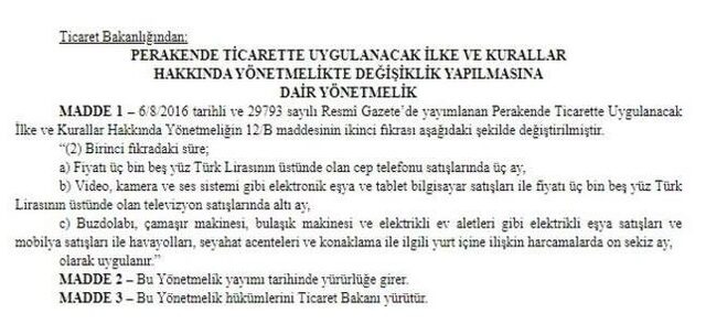 Yönetmelikle perakende işletmelerce tüketicilere yönelik gerçekleştirilen taksitli satışlara ilişkin süre yeniden düzenlendi. Buna göre, hava yolları, seyahat acenteleri ve konaklamayla ilgili yurt içindeki harcamalarda taksit sayısı 18 ay olarak uygulanacak.