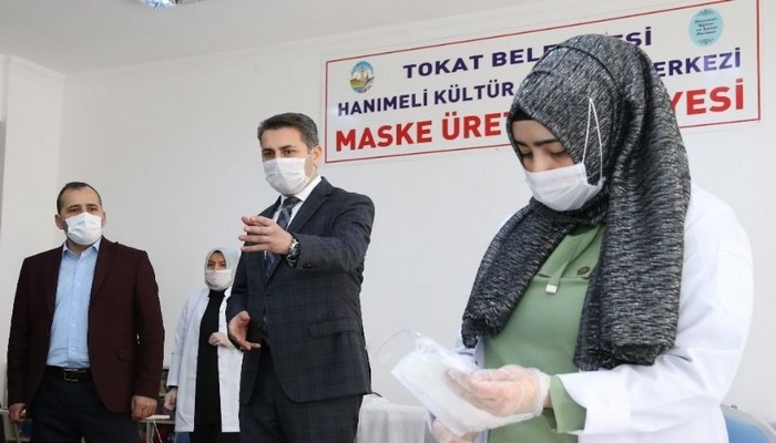 Tokat Belediyesi Hanımeli Kültür ve Sanat Merkezleri ile Mahalle Konaklarında görev yapan personellerden oluşan ekip, İbn-i Kemal Mahalle Konağında kurulan üretim bandında günlük 7-8 bin adet maske üretiyor. Belediye personelleri başta olmak üzere, belediyeye gelen vatandaşlara ve halkın kullanımına yönelik hazırlanan maskeler ücretsiz olarak dağıtılıyor. Maske üretimi yapılan mahalle konağında her gün düzenli olarak dezenfeksiyon işlemleri yapılıyor. Maske üretimi yapılan alanda saat başı üretim makinelerinin temizliği özel karışımlarla sağlanıyor, bütün kullanım alanları dezenfektan ile temizleniyor. Tokat Belediye Başkanı Eyüp Eroğlu, salgından korunmanın öncelikli önlemlerinden biri olan maske kullanımında ihtiyacı karşılamak için maske üretimi yapmaya devam ettiklerini söyledi. Tokat'ta maske kullanma zorunluluğu İl Hıfzıssıhha Kurulu kararı ile devam ettiğine dikkat çeken Başkan Eroğlu, "Biz de kendi imkanlarımızla kendi ihtiyaçlarımızı karşılama yoluna gittik. Şu an için günlük 7-8 bin arası maske üretiyoruz. Bugüne kadar toplamda 210 bin maske üretimi yaptık. Belediyemize işlemleri için gelen hiçbir vatandaşımızı maskesiz almıyoruz. Maskesi yoksa biz veriyoruz. Ayrıca ekiplerimiz, mahallelerimizde vatandaşlarımıza maske dağıtımı yapmaya devam ediyor. Bugüne kadar; Pazar yeri girişlerinde, esnaflarımıza, berber ve kuaför işletmecilerimize ve vatandaşlarımıza 80 bine yakın maske dağıtımı yaptık. Vatandaşlarımızdan maskesiz dışarı çıkmamalarını, çıktıkları takdirde; temizlik, maske ve mesafe kuralına mutlaka uymalarını önemle rica ediyorum" diye konuştu.