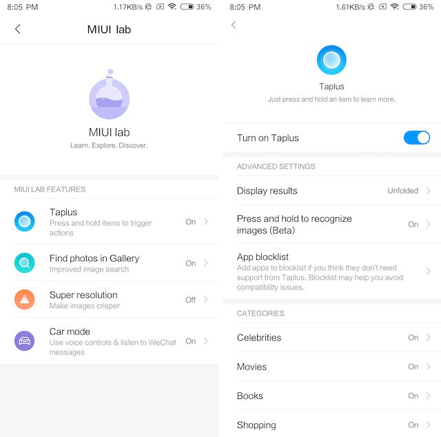 Geçtiğimiz yıl Xiaomi, MIUI 9 kullanıcıları için deneysel özellikleri sunduğu “MIUI Lab” olarak adlandırılan bir bölüm tanıtmıştı. MIUI Laboratuvarı içerisinde yeni özellikleri denemeniz adına bir dizi yeni deneysel özellik sunuyor. Özelliklerin içerisinde bazı eylemleri tetiklemek için öğelere basılı tutmanızı sağlayan Taplus uygulaması da bulunmakta. Ayrıca, yapay zeka kullanarak görüntülerin kalitesini iyileştirmeyi vaat eden yeni bir “Süper Çözünürlük” özelliği yer alıyor.