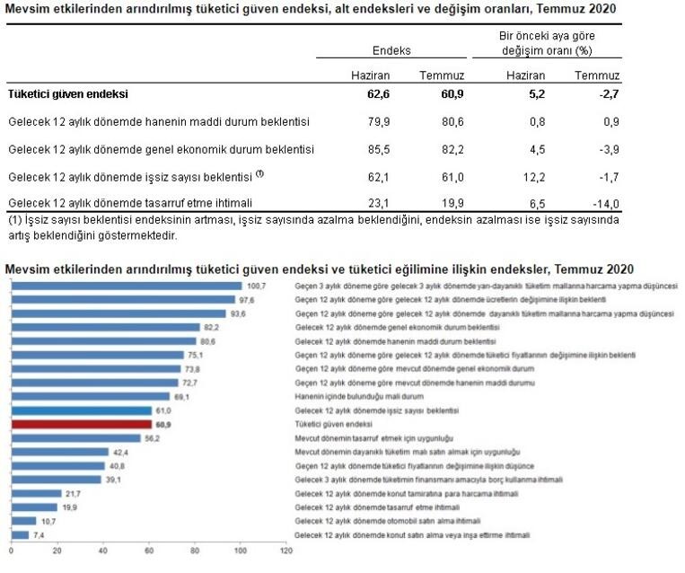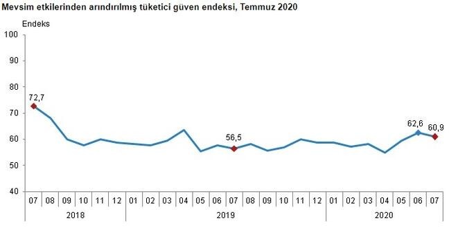Türkiye İstatistik Kurumu ve Türkiye Cumhuriyet Merkez Bankası işbirliği ile yürütülen tüketici eğilim anketi sonuçlarından hesaplanan mevsim etkilerinden arındırılmış tüketici güven endeksi, Temmuz ayında bir önceki aya göre %2,7 oranında azaldı; Haziran ayında 62,6 olan endeks, Temmuz ayında 60,9 oldu.