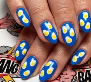 Daha önce belki de hiç görmediğimiz bu nail art modeli pişmiş yumurta görünümünde. Hafifçe dağıtılan beyaz ojenin üzerine sarı oje ile birer daire çizilerek yapılıyor.