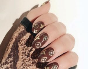 Bu bir çanta markası ve markanın amblemi artık tırnaklarımızı da süsleyecek. Kahverengi ojenin üzerine gold bir ojeyle ve yapışkan taşlarla yapılabilir.