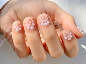 Tırnaklarımızı nude tonlarda boyadıktan sonra inci beyazı ojeyle üzerine minik inciler yapabiliriz.