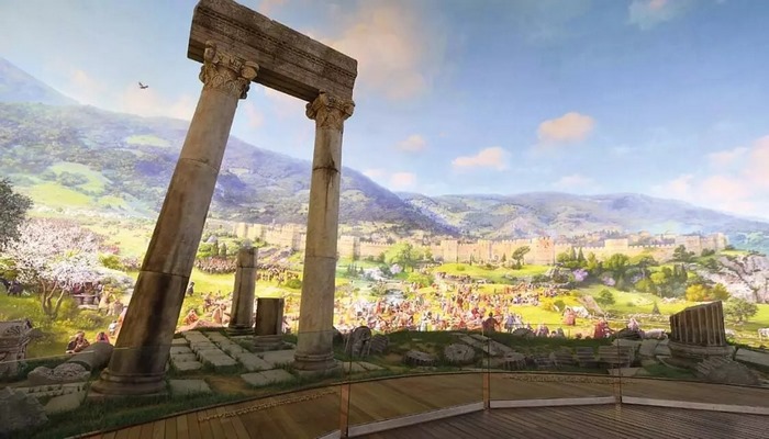 ZAMAN MAKİNESİ GİBİ Bursa’nın 23 yıl süren kuşatma sonunda kan dökülmeden el değiştirdiği tarihi buluşma gününü tasvir eden panoramik resimde, şehirden ayrılarak İstanbul’a gitmeye çalışan Bizanslılar’ın kale kapısından çıkışı tasvir ediliyor. Ön planda, Türkmenlerin kadınıyla erkeğiyle şehri terk edenlere ikram görüntüleri yer alıyor. Panoramik resimde Oğuz Türkleri’nin yaşama gücü ve enerjileri anlatılıyor. Üç boyutlu alandaki tarihi harabe görselleri ise, Türkler Anadolu’ya gelmeden önce bu topraklarda yaşamış ve devrini doldurmuş medeniyetleri temsil ediyor.